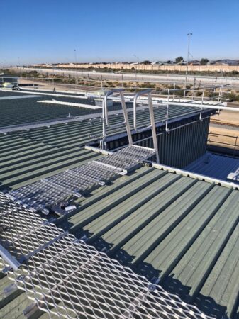 Following detailed site inspections, structural reviews, and consultation with DT Infrastructure’s project team, RISSafety proposed a fully integrated system combining horizontal lifelines, aluminium walkways and roof access ladders.
